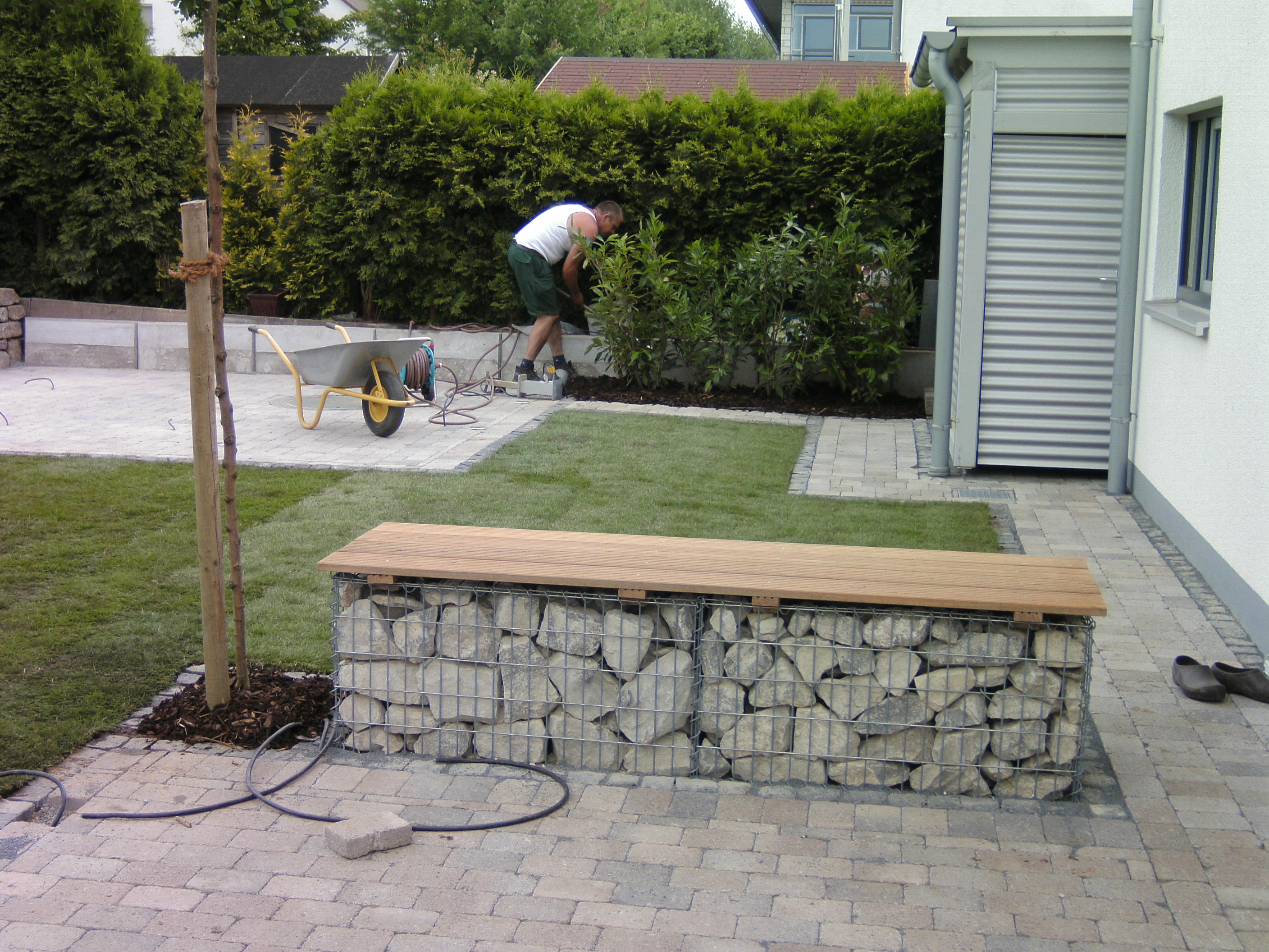 Das nächte Bild zeigt einen am Haus laufenden Gartenweg und einen Unterbau für ein später zu bauendes Gartenhaus. Die Pflasterung ist eingefasst mit Basalt- Natursteinen der Größe 9/11. Am Terrassenrand sehen Sie eine Ruhebank aus Gabionen mit Kalksteinfüllung und einer Sitzfläche aus Bangkirai- Dielen. Der Rollrasen wurde am Tag der Aufnahme verlegt.