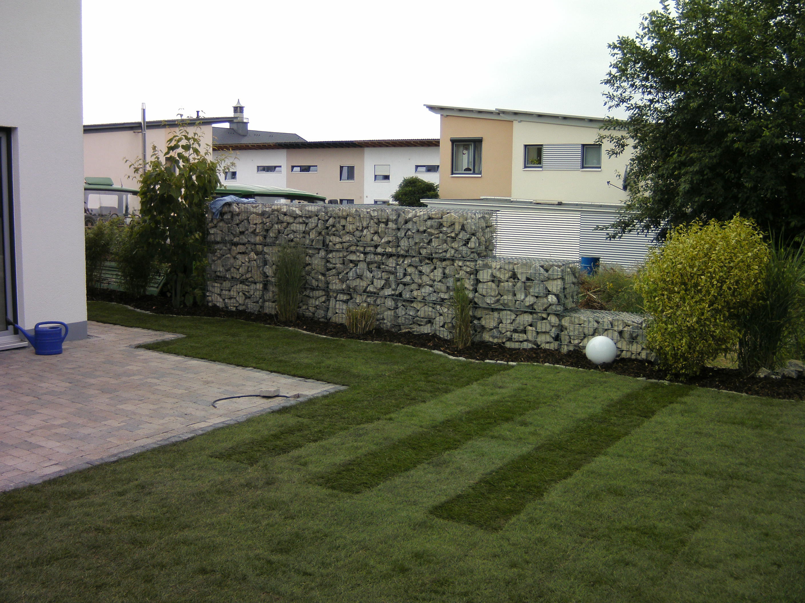 Nachfolgend sehen Sie eine Gartenanlage mit einer neu erstellten Terrasse aus Betonsteinpflaster, frisch verlegtem Rollrasen und einer Sichtschutzwand aus Gabionen mit Kalksteinfüllung.