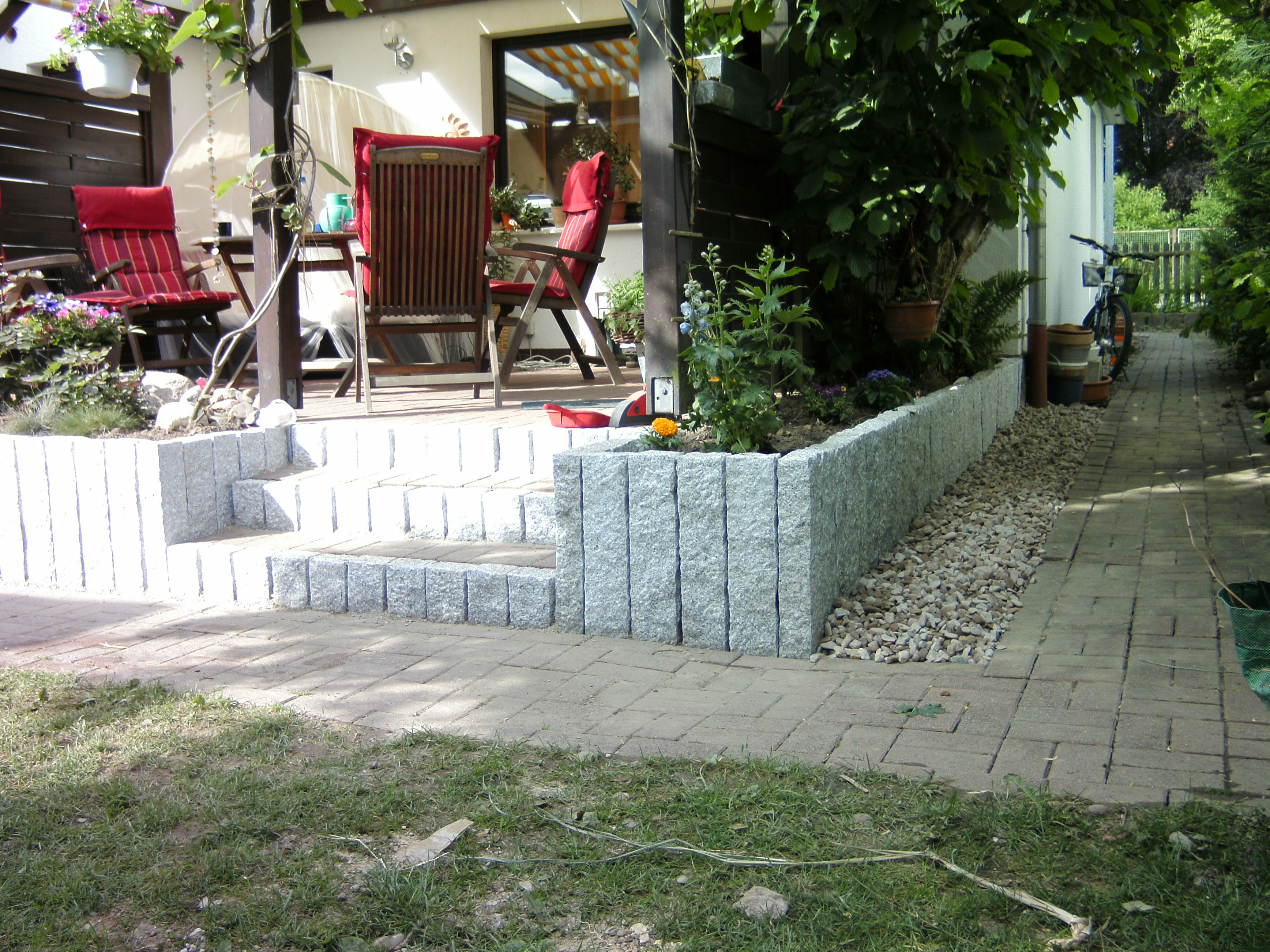 Das folgende Bild zeigt eine Terrasseneinfassung aus Granitpalisaden mit einer Treppenanlage.